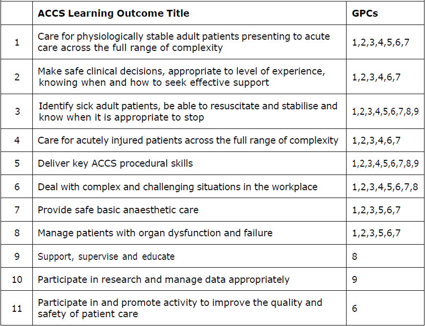 In the ACCS curriculum there are 11 ACCS Learning Outcomes which map to the GMC’s Generic Professional Capabilities (GPCs). The curriculum is outcome-based, which means that it describes the behaviours and performance required during the individual placements and at the end of both the core years of ACCS training and so trainees will need to ensure they have provided evidence demonstrating how they have met the requirements of the ACCS Learning Outcomes.
