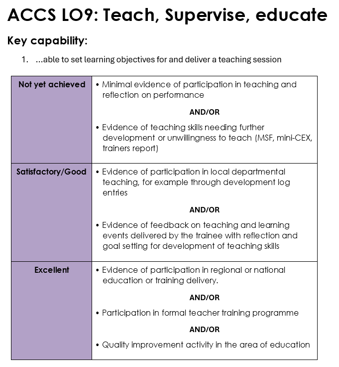 Teaching and supervision is within the Programme of Learning at all stages of training in the ACCS specialties, and the requirements of their respective curricula reflect growing expertise and responsibility in this subject over time.