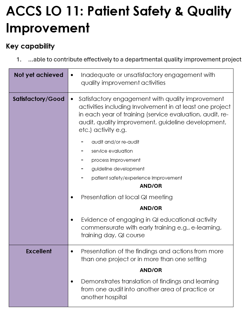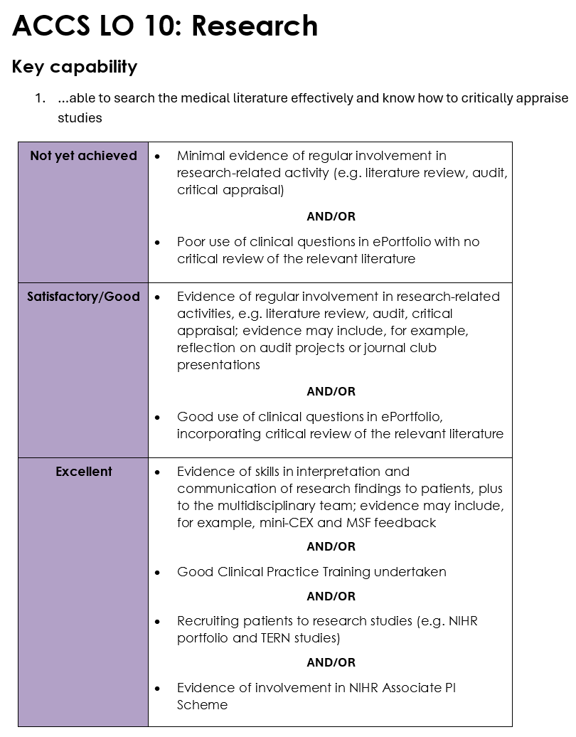 The ACCS Learning Outcomes each contain Key Capabilities (the mandatory aspects that must be explicitly evidenced to satisfy the requirements of the Learning Outcome), and a range of examples (‘descriptors’) of skills, behaviours and attitudes that relate to them.